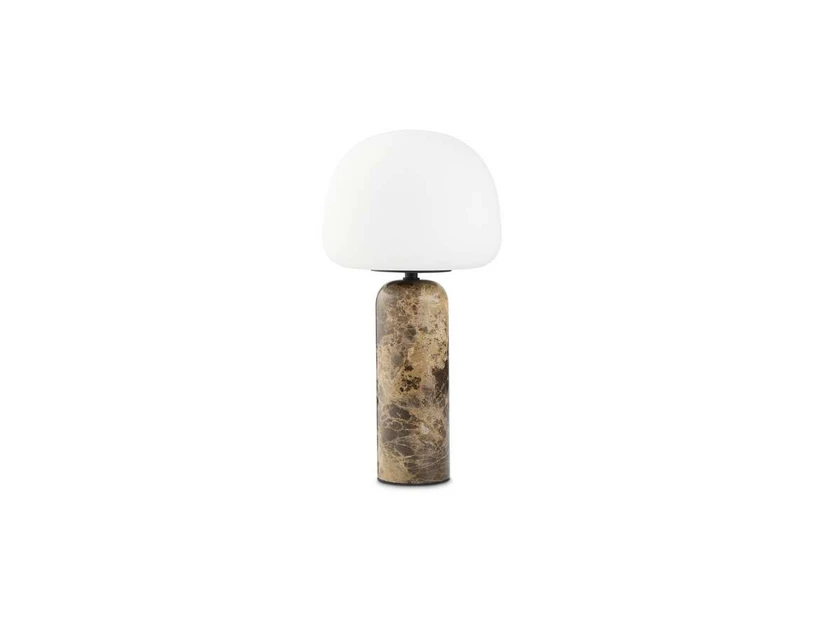 Kin Table Lamp H40 Brown Marble presents itself in a minimalist design that is perfectly suited to all interiors with a penchant for Nordic style. The lamp consists of a base in brown marble and a domed lampshade in white opal glass. The beautiful natural material of the base ensures that each piece of the lamp is unique, so with each Kin Table Lamp you have an individual piece of design art to beautify your personal style.