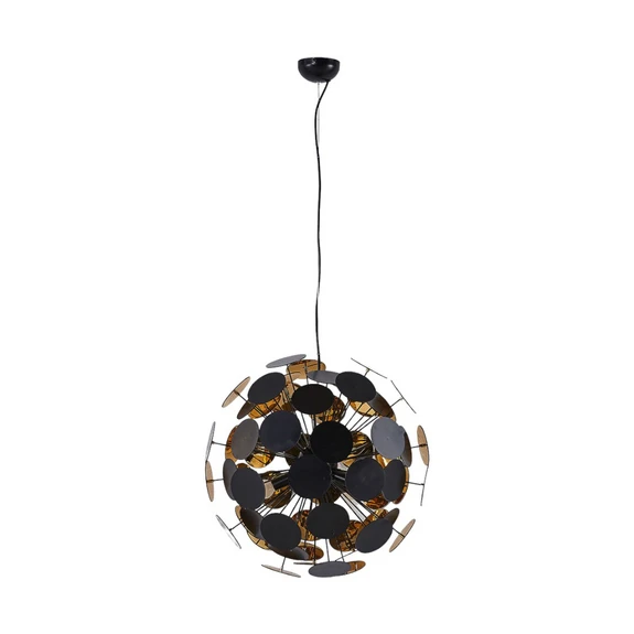 Kinan Pendant Black/Gold features a lampshade made with a pattern of overlapping plastic discs. The dynamic effect is striking when light and shadow flit across the lovely metal shades and find themselves reflected into the room. The gorgeous warm glow of the light sources emerges through the forest of metal stems, creating an atmosphere of glamour and casual luxury.