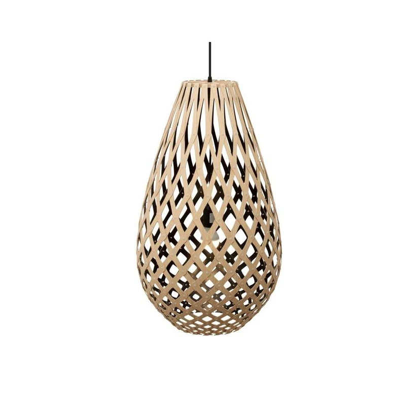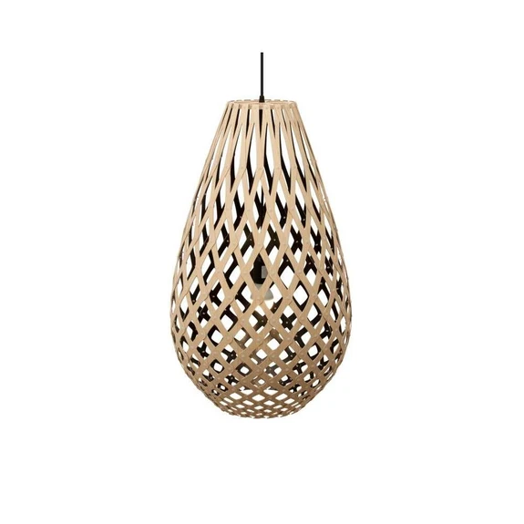 The Koura Pendant H75 Black 1 Side by David Trubridge is a unique and elegant lighting solution that brings the beauty of nature into your home. Made from sustainable bamboo, this pendant light is inspired by the native New Zealand freshwater prawn, kōura, and the traditional traps used by the Māori people to catch them. With its teardrop silhouette, the Koura acts as a sculptural centrepiece that attracts attention and creates a calm and clean atmosphere. The black colour adds a modern edge that fits perfectly into both minimalist and more decorative interiors. With a height of 75 cm and a diameter of 42 cm, this pendant light is ideal for hanging over a bar, in a hallway, stairwell or corridor. Add a touch of natural elegance to your space with this beautiful lamp.