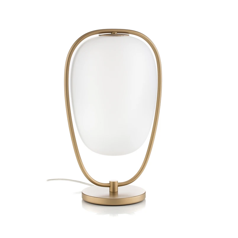 When Lannà is on, it lights up its surroundings and its own lovely design all at once. The lampshade consists of white blown two-layer opal glass, which provides a lovely, glare-free glow. This makes the lamp a beautiful and practical addition to your office or a stylish living room. The lampshade is held in place by a round coloured brass fixture, which repeats the upside-down oval shape. The result is a timeless lamp that you will love for years to come.