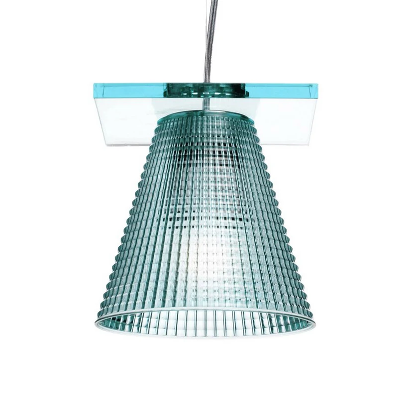 Light Air Pendant Sculped Light Blue is a modern lamp with a practical light and an enchanting effect. The graphic structure of the lampshade is highlighted when the lamp is on, giving the lamp a crystalline appearance and precious glow. Light Air is a clear example of the ability of Kartell to create lovely lamps in sustainable plastic without compromising on the elegant luxurious expression.