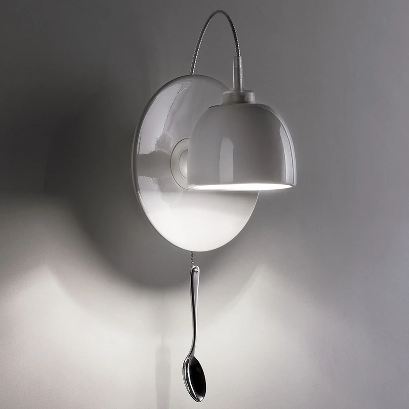 Light au Lait is a charming wall lamp from 2004, designed by Fabien Dumas and Ingo Maurer. The body of the lamp is made from white porcelain in the shape of a saucer and a teacup and it can be turned on and off using the teaspoon attached to a steel wire.