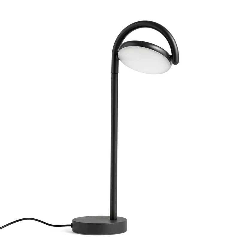 Marselis Table Lamp Soft black is designed based on the bent pipe surrounding Danish street signs. The circular disc can be titled, and a built-in LED light sits where the sign would usually be and can be adjusted to shine either direct or indirect light—a minimalist lamp built around practical light and modern design.