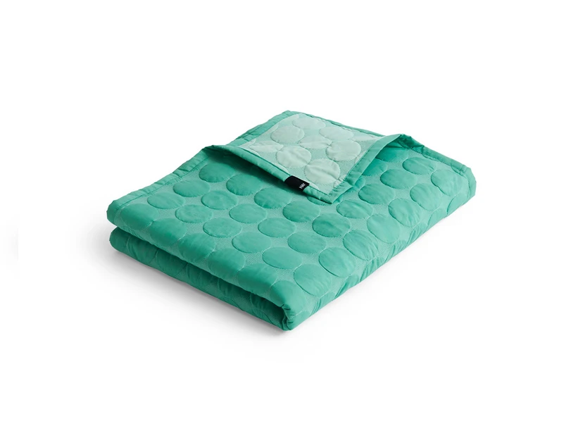 Mega Dot (Organic) 260x260 Sea Green by HAY is the perfect bedspread to add a touch of modern design to your bedroom. This quilted bedspread features a three-dimensional circular pattern that combines modern design ideals with a sensuous graphic expression. Made from soft and durable cotton, Mega Dot offers a two-tone design with a contrasting colour on the reverse, allowing you to vary the look according to mood and decor. The sea green colour adds a calm and natural atmosphere to your space. Measuring 260x260 cm, it fits perfectly on larger beds and can also be used as a decorative rug in the living room. The product is OEKO-TEX® STANDARD 100 certified, which ensures that it is free from harmful substances and is safe for both you and the environment.