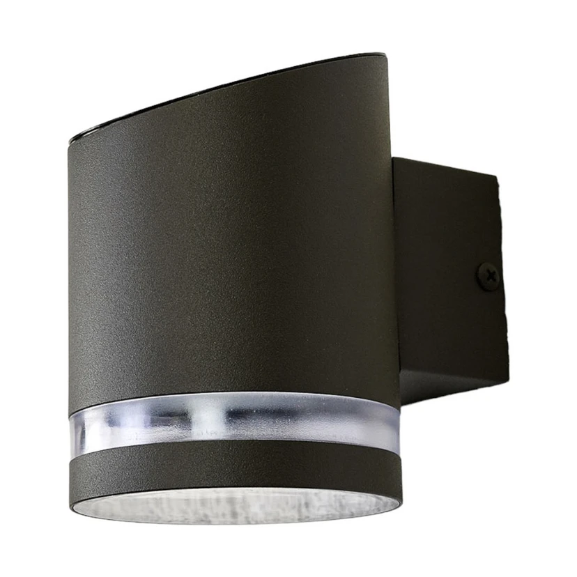 The LED light shines out from a clear cover at the base and from a matt white ring on the fixture, creating a decorative light pattern on the wall. The body of the lamp slopes down at the top, where the solar panel is located, so any rain is effectively deflected.