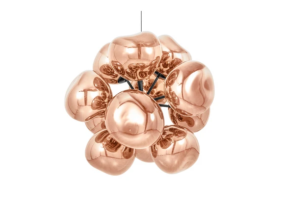 Melt Burst Chandelier Copper by Tom Dixon is a stunning distorted chandelier in a modern copper finish that will add a touch of elegance to any room. Made from metal and plastic, this chandelier features an integrated LED module that creates a mesmerising molten hot blown glass effect when on and a mirror-like finish when off. With its unique design and high-tech manufacturing method, produced in Germany, this chandelier achieves the perfect molten sphere shape that will impress your guests. The Melt Burst Chandelier Copper is ideal for hanging above the dining table, in the living room or in the entrance hall, where it will act as an eye-catching piece of art while providing a cosy light. No matter where you place it, this chandelier from Tom Dixon will add a modern and sophisticated atmosphere to your home.