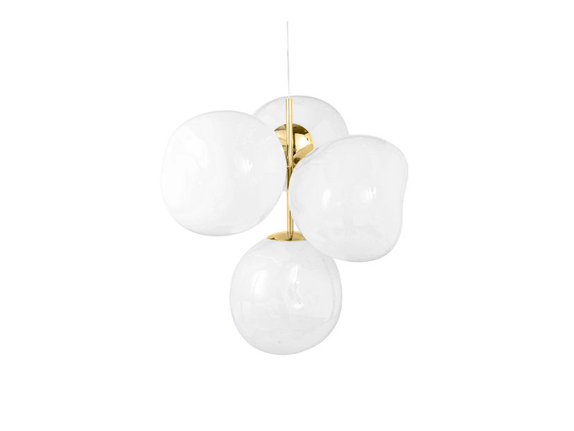 The Melt Chandelier Mini Opal/Gold by Tom Dixon is a unique and stunning chandelier that brings a touch of artistic flair to your home. Created in collaboration with the Swedish design collective FRONT, this chandelier is inspired by the idea of creating an imperfect, organic and natural lighting object. Melt is reminiscent of molten glass, the inside of a melting glacier or images from deep space.