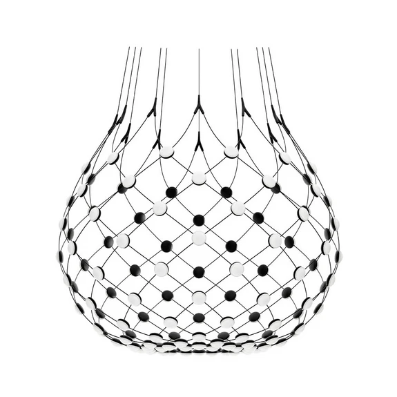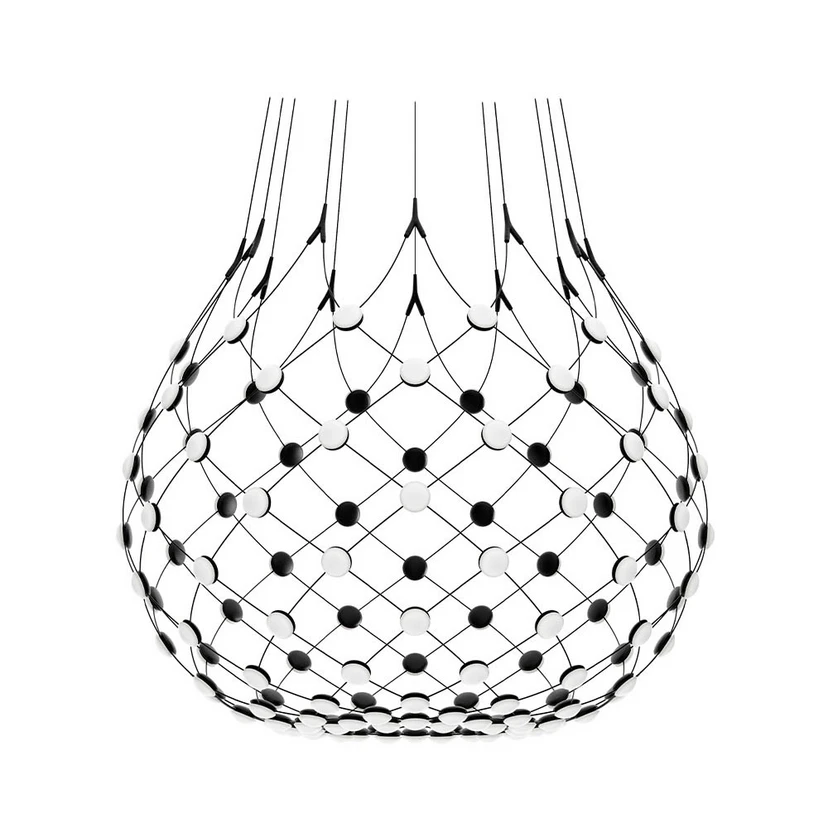 Mesh Pendant Ø100xH90 Phase 5m Black from Luceplan is an impressive pendant light that combines elegance and innovation. Made of metal and polycarbonate, this lamp has a black finish that fits perfectly into modern interiors. With a diameter of 100 cm and a height of 90 cm, it offers a dramatic lighting effect that transforms any space. The almost transparent structure, consisting of flexible cables with LED sources, creates a unique lighting experience where light takes centre stage. With the included Wireless Kit, you can easily control the lighting via the Luceplan Mesh app, allowing you to customise the light according to your needs. Furthermore, Mesh is updated with the Casambi system, which integrates the lamp into an advanced lighting control system. Whether you want functional or aesthetic lighting, this pendant light is the perfect choice for your home.