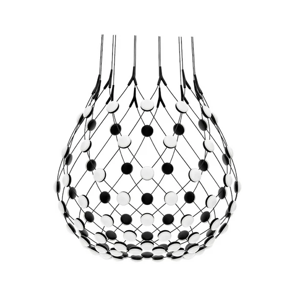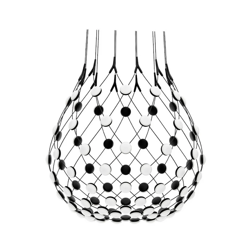Mesh Pendant Ø80xH60 1m w/Wireless Kit Black from Luceplan is an impressive pendant light that combines elegance and innovation. This black lamp, made of metal and polycarbonate, has an almost transparent structure consisting of flexible cables with LED light sources placed at their intersections. This design hides the complexity and emphasises light as the central element. With a diameter of 80 cm and a height of 60 cm, this pendant light offers optimal light distribution in any room. The Mesh lamp can be controlled via the Luceplan Mesh app, allowing you to create different lighting scenarios to suit your aesthetic and functional needs. It's also compatible with the Casambi system, making it possible to integrate it into a broad lighting design control system. Discover how this dramatic and innovative light can transform your home.