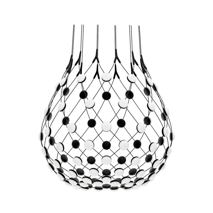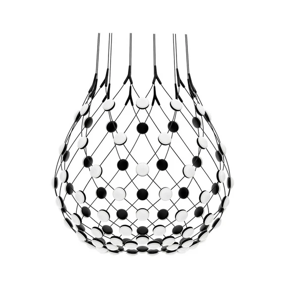 Mesh Pendant Ø80xH60 Phase 4m Black from Luceplan is an impressive pendant light that combines elegance and innovation. Made of metal and polycarbonate, this lamp has an almost transparent structure consisting of a network of flexible cables with LED sources placed at their intersections. The black colour and generous dimensions of Ø80xH60 make it a dramatic and stylish element in any room. With the ability to control the light via the Luceplan Mesh app, you can create the perfect atmosphere in your home. The Mesh pendant light is also compatible with the Casambi system, allowing you to integrate it into a comprehensive lighting design. This lamp offers multiple lighting scenarios that can be customised to your aesthetic and functional needs. Experience a new dimension of lighting design with this unique lamp that fits perfectly into modern interiors.
