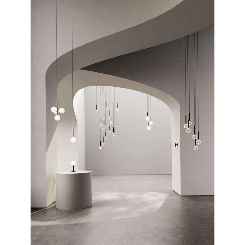 The complete Miira collection includes pendant and chandeliers –, including Miira in Rock Grey and versions with opal glass and clear lampshades.