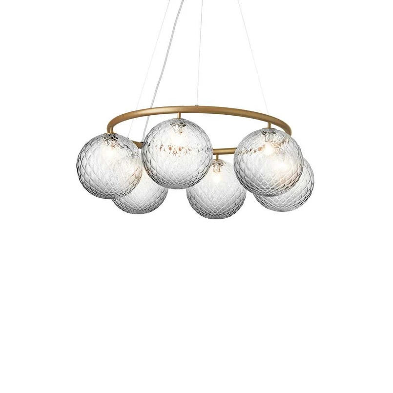 Miira 6 Circular Chandelier Brass/Optic is a stylish minimalist lamp. The popular brass interacts with the graceful shape of the lamp in the most beautiful way whilst creating a gorgeous contrast—dynamic yet calm and balanced. A diffuse and comfortable glow shines through the circular lampshade, contributing to a calm, relaxed atmosphere.