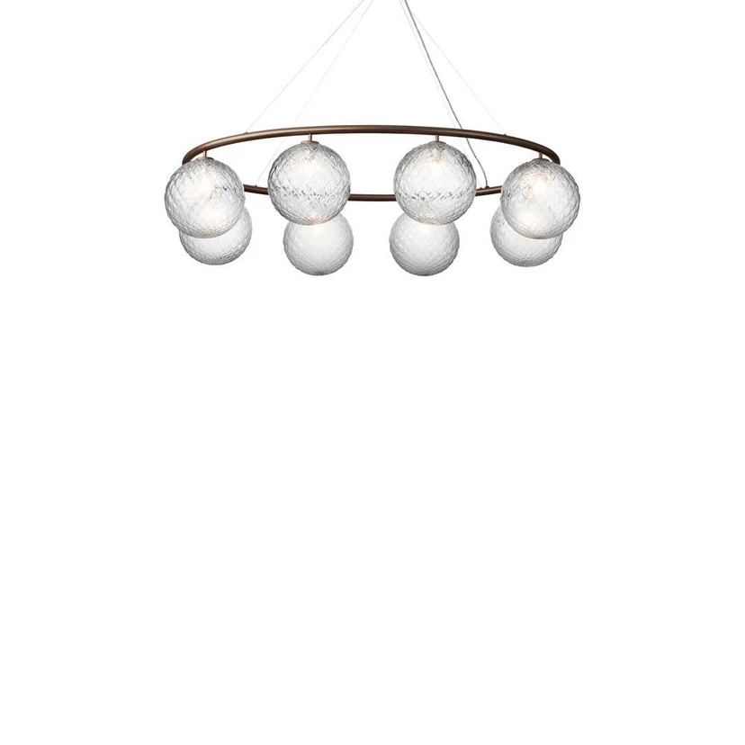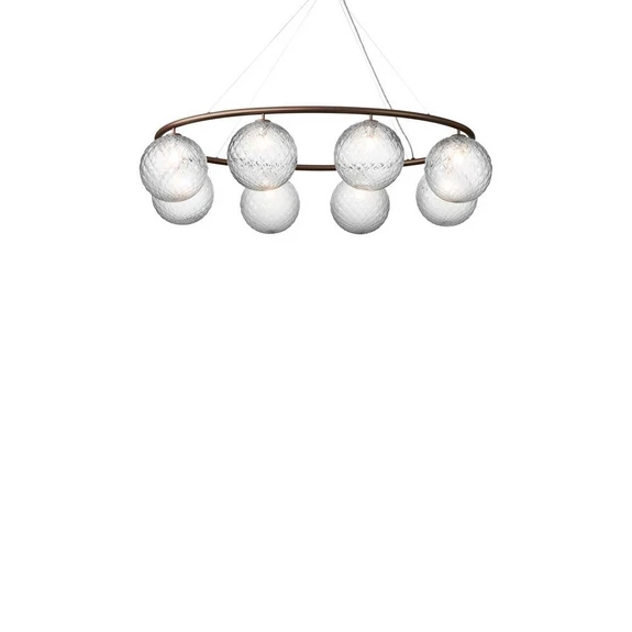 Miira 8 Oval Chandelier Dark Bronze/Optic Clear enriches the room with a special atmospheric ambience. The eight light sources each consist of a spherical glass shade regularly arranged around a circular metal frame with a beautiful surface finish. With a diameter of 1 metre, the elegant chandelier creates a diffused light that reaches all corners of the room. The chandelier is available in several different colour variants, some with pearl white lampshades for soft and diffused light distribution and others with transparent lampshades in a fascinating diamond-shaped surface pattern. This gives the light a beautiful, smouldering character that contributes to a cosy and nostalgic look.