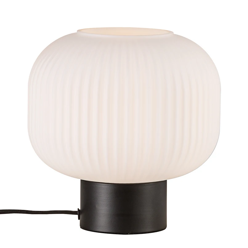 Milford Table Lamp Metal/Opal is a wonderful combination of style and cosiness in a harmonious, retro-inspired design. The lamp has a characteristic elongated lampshade with a pleated structure. The lampshade is not made of fabric but of mouth-blown glass and therefore gives off a particularly pleasant, diffuse lighting when you switch on the lamp. The light shines in a cosy all-around glow that creates an atmospheric ambience. The simple, stylish lamp design can be easily integrated into private homes as well as cafés, restaurants, hotels, hotels or other areas where a relaxed atmosphere is desired.