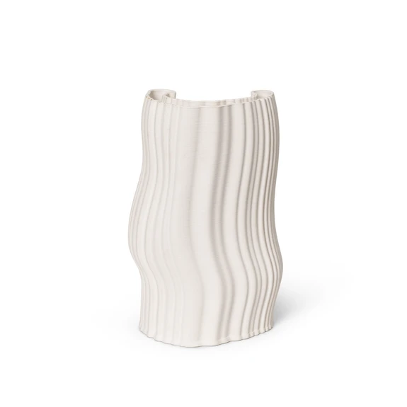 The beautiful vase breaks with expectations of what a vase should look like - and uses an atypical shape to surprise and seduce. Moiré comes from the French word for wave-shaped, and waves are a recurring theme in the vase - both in the way it is shaped and how the thin walls of 3D-printed clay are layered on top of each other.