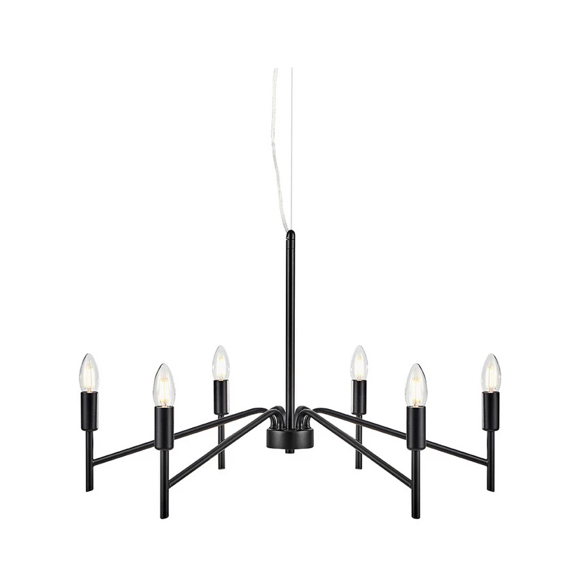 Monarch 6 Pendant Light Black from Markslöjd is the perfect addition to your home if you are looking for an impressive pendant light. This elegant pendant light, made of matt lacquered iron, exudes a timeless elegance that fits perfectly in both the kitchen and living room. With its six light sources, Monarch creates a mesmerising illumination that completes any room. The black colour gives a sophisticated look, while the solid material ensures a durable solution that will stand the test of time. The lamp requires six light bulbs with a small socket (E14) of max 18W or LED equivalent, which is not included. With a diameter of 70 cm and a 1.5 metre long transparent cord, this pendant light is both practical and stylish. Monarch 6 Pendant Light Black is a safe choice for those who want to combine functionality with aesthetics in their home..