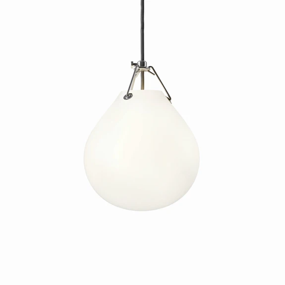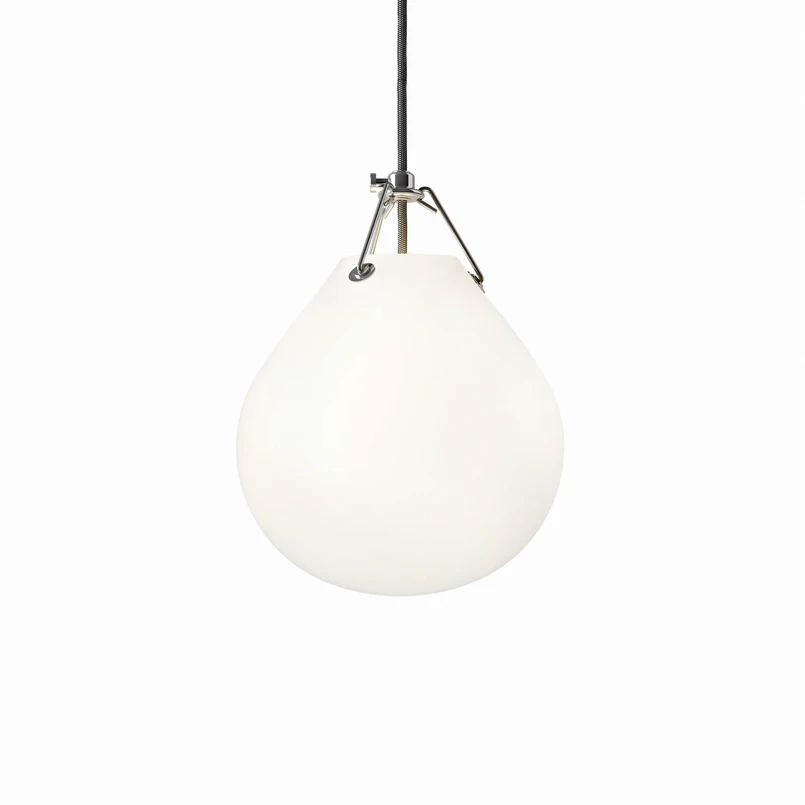 The Moser pendant was designed by the Swedish ceramist Anu Moser in 2002. The inspiration for the lamp’s different shapes arose when the designer observed how a glass mass develops when it is first hand-blown. Anu Moser chose the closed teardrop shape in order to shield 100% against a direct line of sight to the bulb and the lamp provides diffuse illumination. The lamp was developed to be energy-efficient and the lamp’s suspension system is patented.
