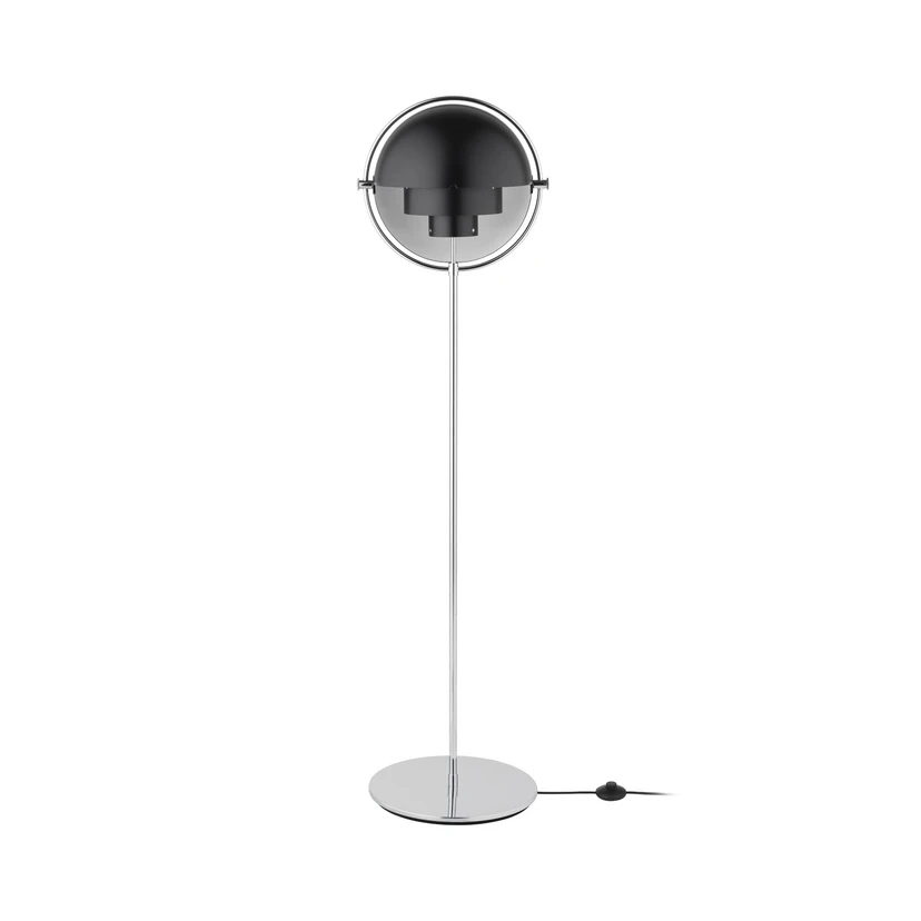 The Multi-lite s Floor Lamp Chrome/Black was designed by Louis Weisdorf back in 1972. It consists of two inner, cylindrical lampshades while the two-quarter lampshades in a spherical shape make up the outer lampshades and can be rotated individually around the axis. The distinct lamp is easily adjusted from one setting to the other, directing the light upwards or downwards, or creating an asymmetrical or artistic light. The construction of the lamp and the adjustable lampshades ensures the utmost functionality and invites you to play around with the light.