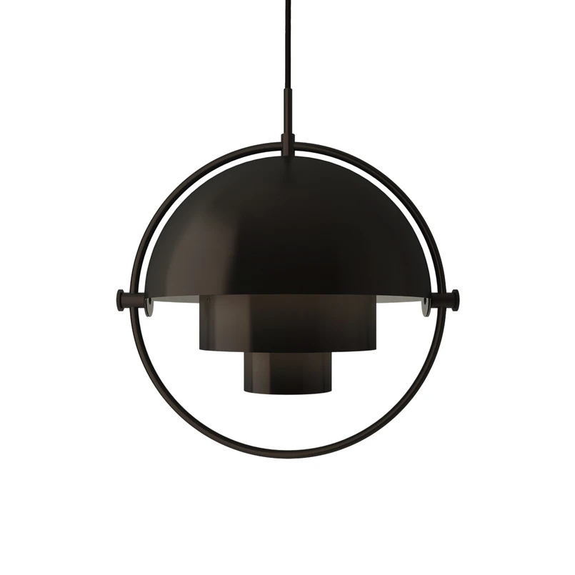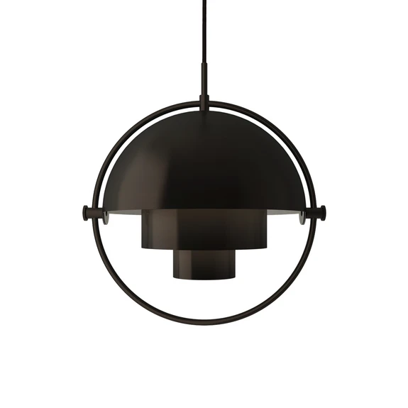 Multi-Lite Pendel Black Brass was designed by Louis Weisdorf back in 1972. It consists of two inner, cylindrical lampshades while the two-quarter lampshades in a spherical shape make up the outer lampshades and can be rotated individually around the axis. The distinct lamp is easily adjusted from one setting to the other, directing the light upwards or downwards, or creating an asymmetrical or artistic light. The construction of the lamp and the adjustable lampshades ensures the utmost functionality and invites you to play around with the light.
