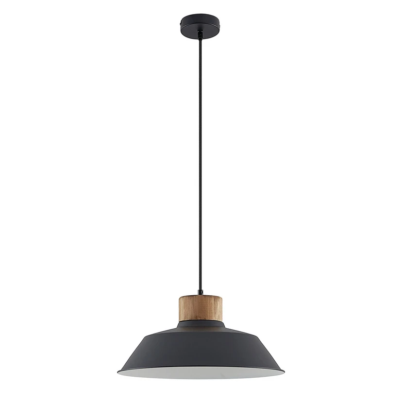 Nefeli Black presents itself in a modern design with few but striking details that give the lamp an individual character. The lamp is solidly designed in steel with a black surface, giving it a solid appearance. The heavy, raw look is beautifully complemented by a wooden element at the top of the lampshade. This is made from pine wood, which has been allowed to retain its natural colour, so that each lamp has unique grain markings. The dark exterior is also balanced by a white interior that reflects the light effectively, allowing it to appear even brighter when you switch on the lamp.