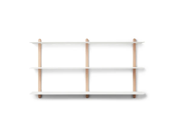 The Nivo shelf is designed without superfluous elements, giving it a floating and elegant look. Every detail is well thought out, from the invisible screws to the bevelled cuts in the ribs that make the shelves slide perfectly into place. The large version of the Nivo shelf offers more applications than the smaller version, thanks to the larger shelves and increased weight capacity. It is available in six different configurations and can be customised to your needs.