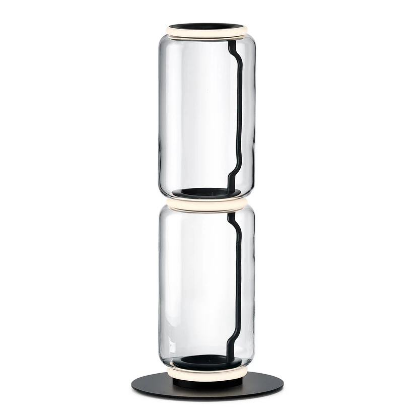 The Noctambule F2 Floor Lamp Low Cylinder by Flos is an impressive floor lamp that combines elegance and functionality. This floor lamp consists of interconnected glass modules that reach a height of 2.17 metres, making it an eye-catching element in any room. The cylindrical and hemispherical structure is made of mouth-blown crystal for a clear and sophisticated look. The base and rings are made of die-cast aluminium, while the inner lateral arms are made of hydroformed steel. The lamp's outer ring diffusers are created from optical opal silicone, ensuring even and comfortable lighting. With a 2-metre power cable and a pedal-operated panel dimmer, you can easily adjust the light intensity from 10% to 100% to suit your needs. This floor lamp is ideal for creating a cosy atmosphere in the living room or as a stylish accent light in the entrance hall.