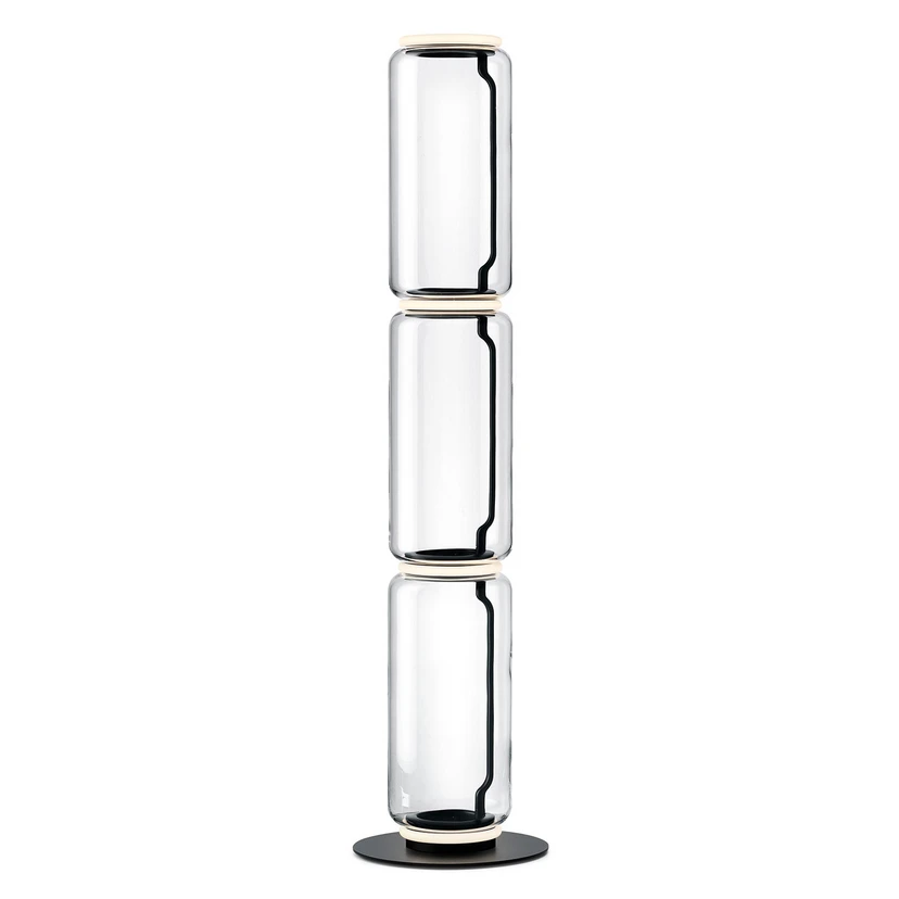 The Noctambule F3 High Cylinder Floor Lamp by Flos is an impressive floor lamp that combines elegance and functionality. This floor lamp is created from interconnected glass modules that reach a height of 2.17 metres, making it a striking element in any room. The structure of the lamp consists of cylindrical and hemispherical mouth-blown crystal for a clear and modern look. The base and rings are made of die-cast aluminium, while the inner lateral arms are made of hydroformed steel. The outer ring diffusers are made of optical opal silicone, ensuring an even and comfortable light distribution. With a 2-metre power cable and a pedal-operated panel dimmer, you can easily adjust the light intensity from 10% to 100% to suit your needs. This floor lamp is ideal for creating a cosy atmosphere in the living room or as a stylish light in the entrance hall.