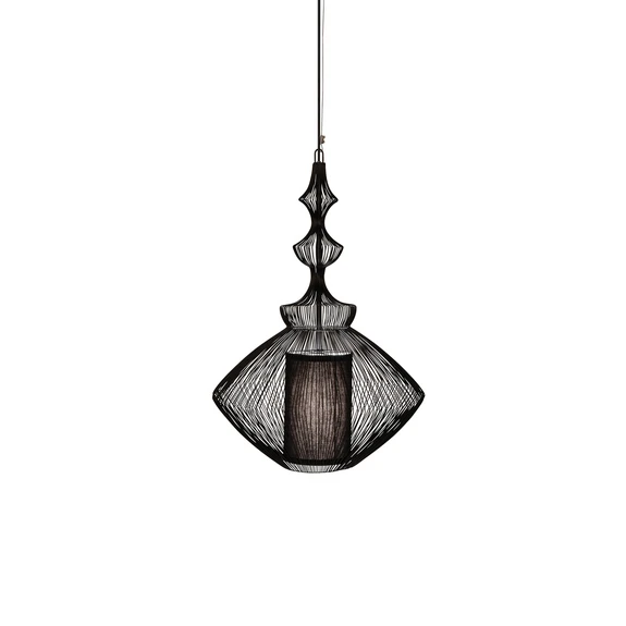 Opium Suspension Black is regal and sensual all at once. The many decorative details come into their own when the lamp is on and the light from the internal cylindrical lampshade fills the entire structure.