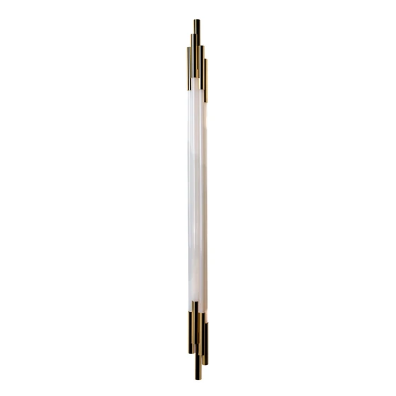 Org Wall Lamp 1500 Gold is a lovely eye-catching lamp inspired by the worlds of sci-fi and astronomy. It has a simple look, composed of a range of glass tubes framed by anodised aluminium and assembled to form an asymmetrical cluster of light. The lamp is surprisingly both classic and modern whilst its pairing of glass and gold contributes an element of elegance.