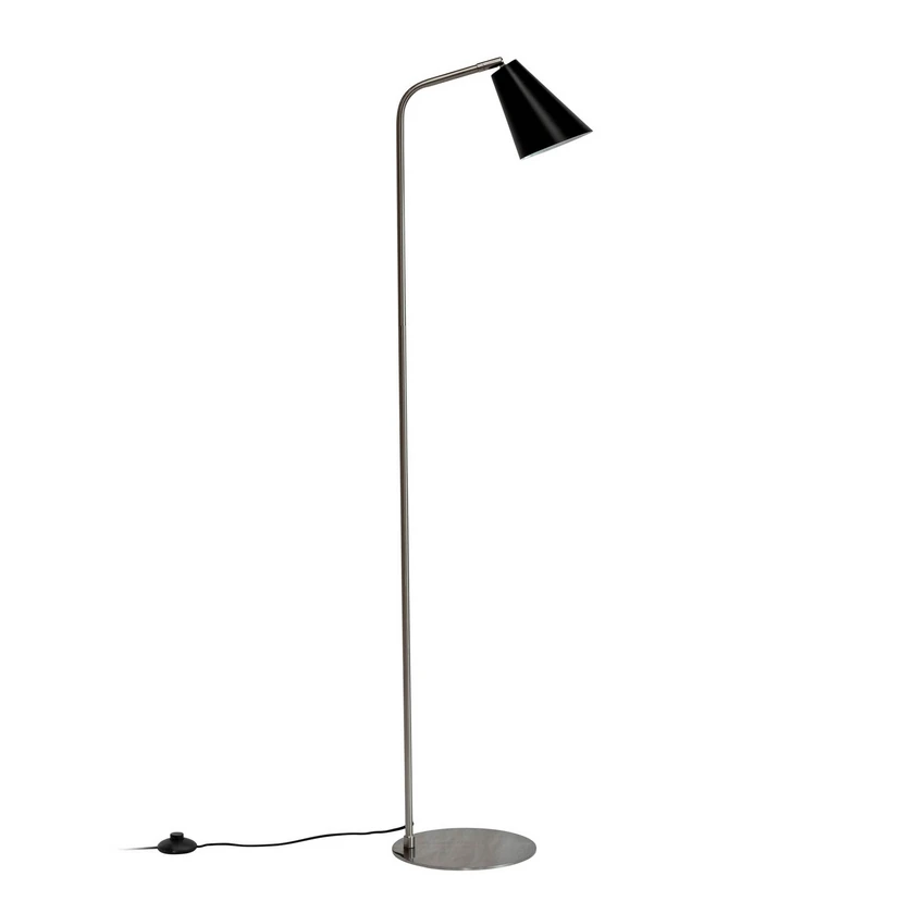 Oswald Floor lamp Black/Steel presents itself in a modern design that is both simple and characterful at the same time. The lamp is characterised by a dark colour scheme with a shiny steel frame and a black lampshade that has an asymmetrical design with sloping lines. This gives the lamp a characterful edge and puts a modern spin on the conventional lamp design.