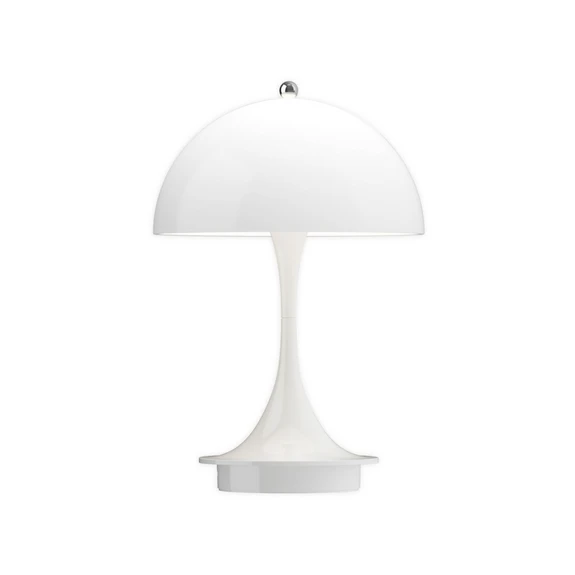 This lamp is one of the new Panthella 160 portable table lamps, which comes with a number of new and improved features, such as the new on/off touch dimmer on the top nut, which makes it easy to adjust the brightness with a light touch from 0%/10%/33%/100%. It also comes with improved battery life, providing up to 8.5 hours at 100% brightness, 25.5 hours at 33% and a whopping 79 hours at 10%. In addition, the lamps only come with polymer lampshades that have the same thickness for both opal and opaque versions. At the same time, the Panthella 160 family is expanded with four new finish options for both the opal and opaque lampshades, so there are now a total of 13 different variants. The lamp also has an IP44 rating, making it suitable for humid environments.