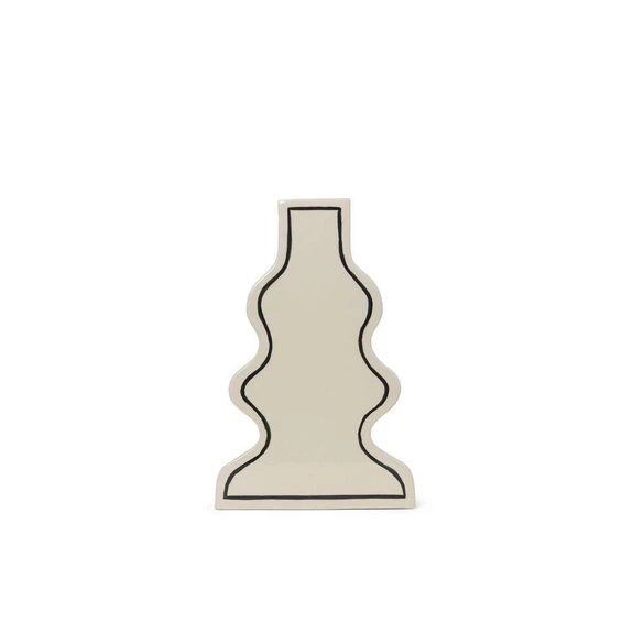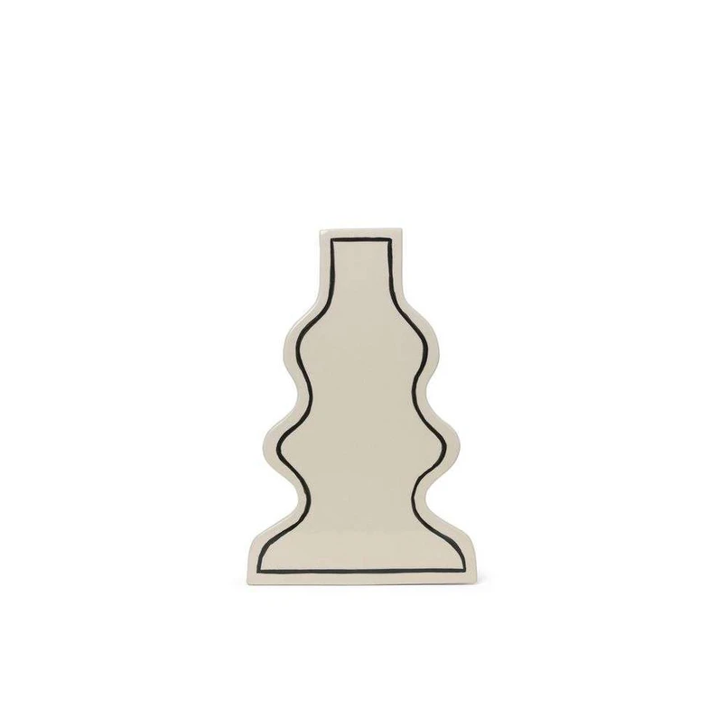 The Paste Vase Curvy Off-white makes a particularly beautiful addition to the home through its whimsical and artistic play with two- and three-dimensional silhouettes. The distinctive design consists of two identical flat ceramic plates attached to a traditional cylindrical vase. This gives the impression of a 2D figure when viewing the vase en face. However, turning the vase and viewing it in profile adds a surprising 3D effect that creates a fun and dynamic play in the beautiful decorative vase. The two-dimensional expression on the front is emphasised by fine, hand-painted lines that beautifully follow the asymmetrical shape of the plate. The handmade aspect of the design is thus clearly visible and gives the vase a strong sense of authenticity.