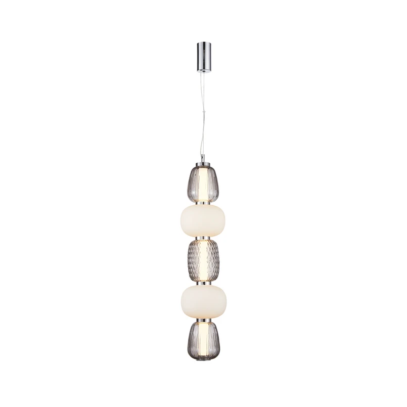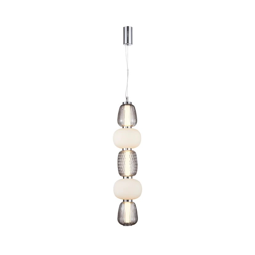 Pearl 5 Pendant Grey/Opal/Chrome catches the eye with its aesthetically pleasing design and soft lighting that enriches the room in a stylish way. The pendant light is characterised by its marvellous composition of transparent and matte opal glass, both mouth-blown and processed by hand. The beautiful string of glass shades envelops the light body in the form of a built-in LED that efficiently converts small amounts of power into large amounts of light. The alternating glass creates alternating direct and indirect lighting with a beautiful effect that emphasises the harmonious design. The combined lighting makes the lamp suitable as a supplementary light source in larger rooms, be it the living room or bedroom. A true gem in interior design!