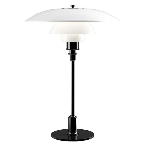 The PH 3½/2½ table in metallic black is a member of the 3-shade family that now consists of 18 lamps, three of which are designed for outdoor use. Poul Henningsen created the 3-shade system back in 1925-1926, when in cooperation with Louis Poulsen he designed the first lamps for an exhibition in Paris. Throughout his life, PH sought to create glare-free light that could be directed where it was needed and created soft shadows.