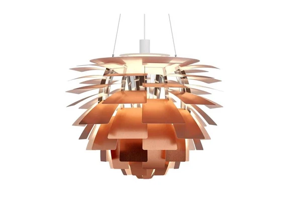 PH Artichoke Ø840 Copper was designed by Poul Henningsen in 1958. He was commissioned to design a pendant light for the Langelinie Pavilion Restaurant in Copenhagen with a specific request that it be 100% glare-free. His ingenious solution of 72 leaves in 12 straight rows provides a totally glare-free light, no matter what angle you look at it from. Today, the pendant is considered a design icon that is loved and known all over the world, while it still adorns the Pavilion in Copenhagen. The PH Artichoke has also been nicknamed 'The Cone' due to its distinctive appearance.