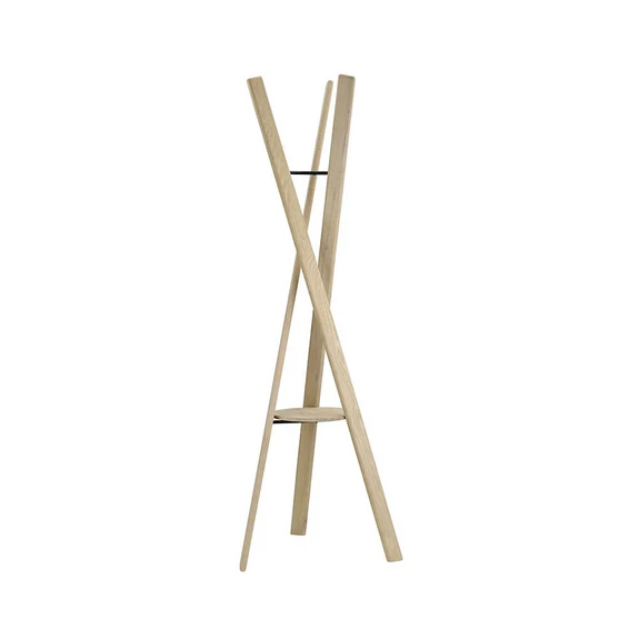 On the round plate you can place keys or bags, while the three wooden elements provide ample space for jackets, scarves and hats. You can also hang hangers on the metal connectors as needed. The Rakku coat rack comes fully assembled and is available in both natural and black stained oak, making it a versatile choice for any interior. Add a touch of Japanese design and functionality to your home with this unique dumbwaiter.