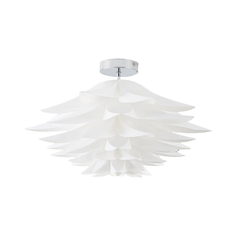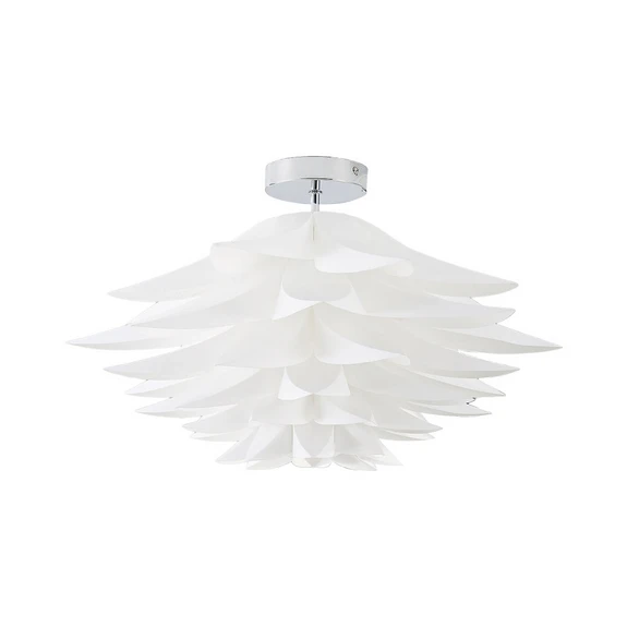 The Rimon Ceiling Light White/Chrome quickly becomes a visual highlight in your interior thanks to its decorative design and beautiful light quality. The lampshade is composed of several individual parts in white plastic to form a beautiful, multi-part flower crown that unfolds beautifully on the ceiling. This design is not only an aesthetic eye-catcher, but also ensures a cosy and varied light pattern. When the lamp is switched on, light passes through the many white leaf elements in varying amounts, creating a fascinating pattern of bright and dimmed light that beautifully emphasises the design of the lamp. The only place the light escapes directly is the centre of the lamp. This creates a narrow direct downlight surrounded by a wide indirect all-round light. This type of light is ideal for the living room or bedroom.