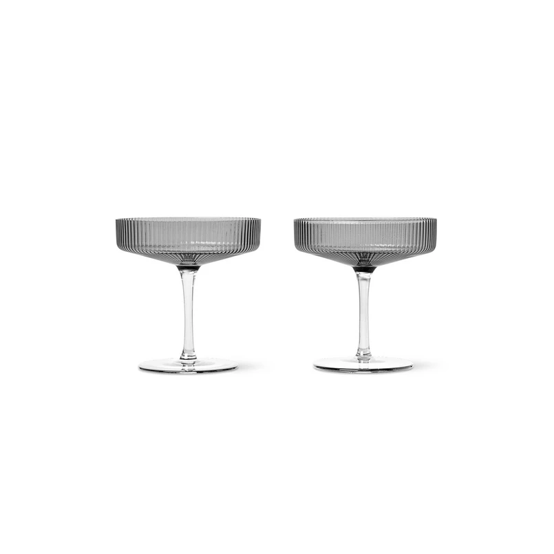 Ripple Golden Saucers Set of 2 Smoked Grey from the incredible brand Ferm Living is another incredible addition to your collection and arsenal of glass kitchenware! Like the rest of the Ripple collection, Ripple Champagne Saucers Set of 2 Smoked Grey is made of blown glass, and its remarkable quality is palpable when you hold it in your hand. The Ripple collection takes its name from the rippled surface found on all the members of the collection.