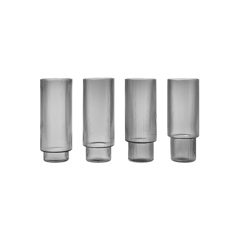 Ripple Long Drink Glasses Set of 4 Smoked Grey from the incredible brand Ferm Living is another incredible addition to your collection and arsenal of glass kitchenware! Like the rest of the Ripple collection, Ripple Long Drink Glasses Set of 4 Smoked Grey is made of blown glass, and its remarkable quality is palpable when you hold it in your hand. The Ripple collection takes its name from the rippled surface found on all the members of the collection.