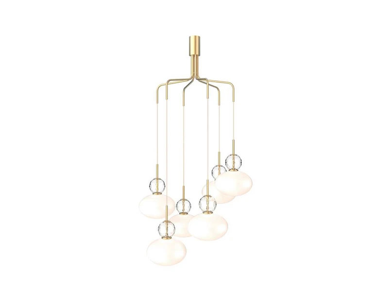 Rizzatto Cluster 6 Chandelier Satin Brass/Opal is recommended for anyone who loves beautiful aesthetics and classic design with modern notes. The chandelier is formed from six individual pendant lights from the Rizzatto range arranged at different heights to form a cluster of beautifully designed lampshades with all the characteristics that characterise the other lights in the range. The metal frame has a shiny finish, while the lampshade is made of mouth-blown glass and has a pearl white matt surface that adds a touch of sophisticated extravagance to the overall design. The glass shade completely encloses the light source. Therefore, when you switch on the lamp, the light shines through the glass in a soft and uniform glow.
