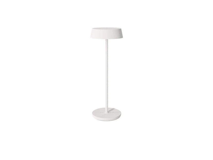 Rod Cordless Portable Table Lamp IP54 Ivory from Lodes is an elegant and functional table lamp that combines modern design with practicality. This portable lamp is made from robust metal and aluminium, ensuring durability and a stylish white finish that fits into any home. With a height of 35.6 cm and a diameter of 13.36 cm, it's perfect for creating a cosy atmosphere in the living room, bedroom or terrace. The slender stem connects two imaginary cement blocks that elegantly lift the lampshade, which contains an energy-efficient LED light source. You can easily adjust the brightness by simply touching the top of the lampshade, making it easy to customise the lighting to your needs. This lamp is ideal for those who want flexibility and style in their lighting solutions..