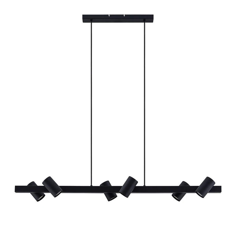 Savoli Pendant Light Black is characterised by a stylish simplicity but avoids anonymity thanks to its slightly different take on the conventional dining table pendant. The lamp has a functional character through its solid steel frame, black monochrome surface and efficient spotlights. The total of six spotlights are arranged in pairs on a crossbar to effectively illuminate a wide area. Each of the six spots can be rotated to both emphasise specific areas and change the overall light pattern to match your individual needs.