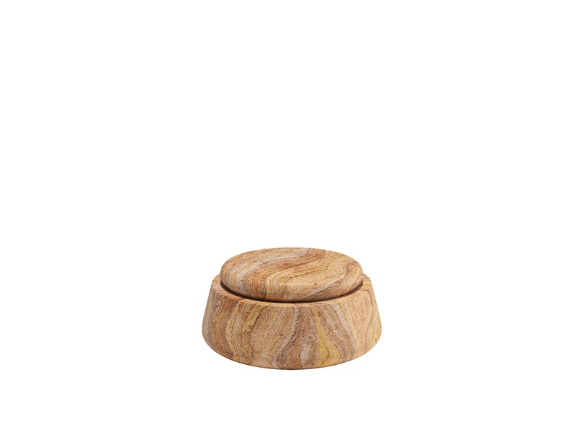 The Serene Jar Low Rainbow Sandstone from Woud is a beautiful jar that brings the tranquillity of nature into your home. Made from solid sandstone, this jar offers an authentic connection to natural materials. The brown and beige colour palette creates a warm and inviting atmosphere, while the round, cylindrical shape adds a modern elegance to your decor. Each jar is handmade, which means you may experience slight variations in both shape and colour, which only enhances its unique character. The Serene Jar is perfect for highlighting your favourite plants or as a decorative object in its own right. Its low height makes it ideal for placement on tables or shelves where it can add a touch of sculptural simplicity and boldness. Discover how this jar can transform your space with its calming presence.