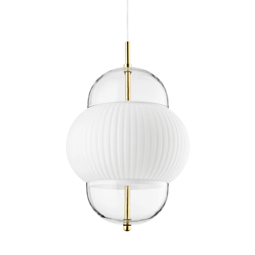 The lamp combines stunning circles, and the outer opalised white circle brings to mind the beautiful white belly of the peregrine falcon. The lamp floats effortlessly in the room, and the transparent design makes the lamp appear weightless. Although the almost glamorous design catches the eye, the lamp commands attention without stealing the show.