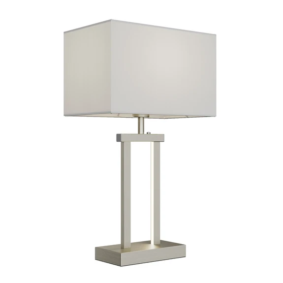 The lamp has a square basic shape with a rectangular base, a two-part frame that forms a rectangle in the space between them, and a rectangular lampshade made of white textile. The light easily penetrates the light-coloured fabric, making it appear soft and even. As the lampshade is open at both ends, you also get a beautiful two-part glow. The switch is located underneath the lampshade for quick and easy operation.