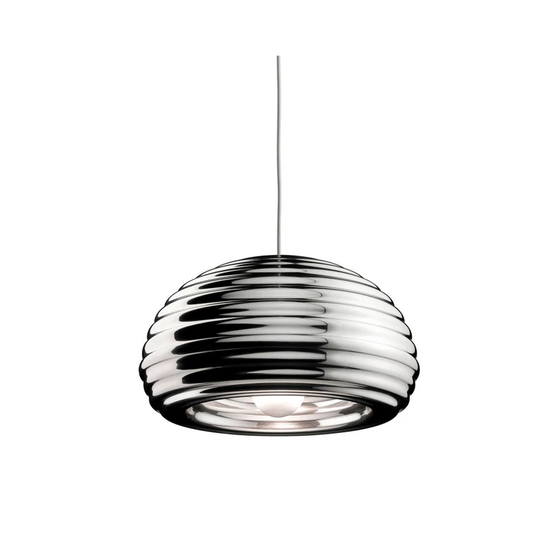 The Splügen Braü pendant is inspired by the glossy surface of thermos bottles and 60s cocktail shakers. Splügen Bräu has a thick, ruffled aluminium shade and was originally intended for restaurants, dining halls and beer halls. It was eventually adopted into the Flos collection. This pendant is a genius way of parting with the frigidity of modernism. Splügen Bräu is a stylish and warm pendant with a history.