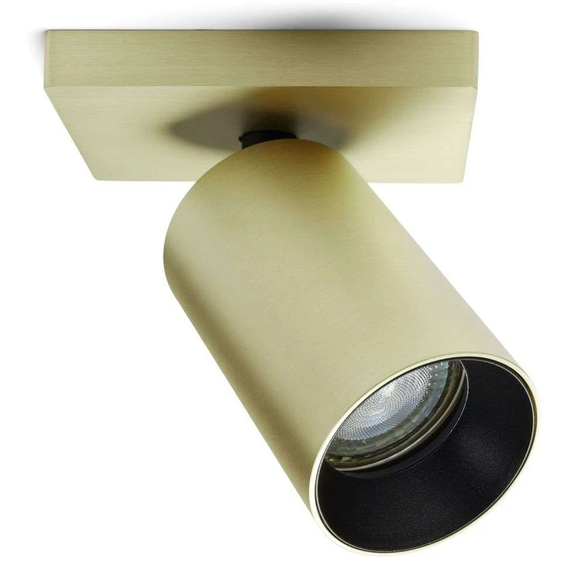 SpotOn1 Ceiling Lamp Brass has a simple expression with neat and elegant lines. It comprises a simple quadratic base with an adjustable spotlight—360 degrees vertically and 90 degrees horizontally. The light source is set in the cylindrical lampshade and creates a direct spotlight that shines wherever you need it most.