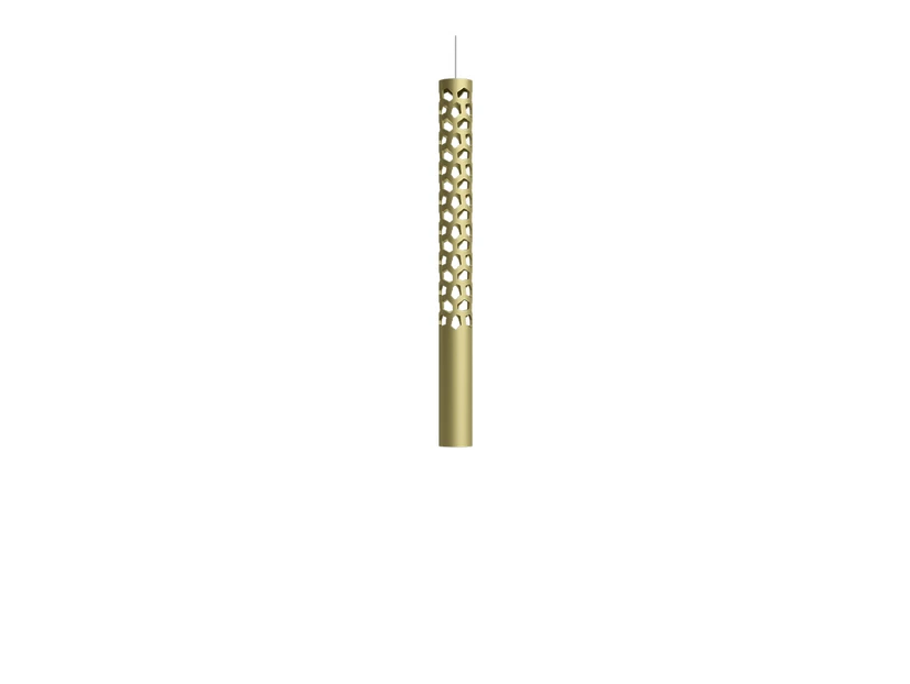 The Squiggle H6 Pendant Light Gold from Rotaliana is a unique and elegant addition to your home. Made of metal and with a beautiful golden finish, this pendant light is inspired by Lucio Fontana's Neon structure from the 9th Triennale in Milan. The hanging tubular exoskeleton hides an LED strip that can stretch up to 6 metres, creating an impressive lighting effect. The irregular, hexagonal holes in the metal create a light and airy structure that forms different geometric shapes such as broken curves, infinity symbols and concentric rings in different sizes. This pendant light is ideal for creating a modern and artistic atmosphere in any room, whether it's over the dining table, in the living room or in an entrance hall. With its innovative design and functionality, the Squiggle H6 Pendant Light Gold is a perfect choice for those who want to add a touch of luxury and creativity to their interior design.
