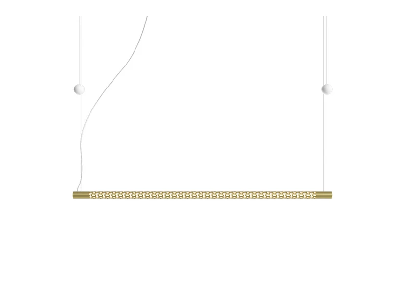 The Squiggle H8 Pendant 3000K Gold from Rotaliana is a unique and elegant lighting solution that will add a touch of artistic flair to your home. Inspired by Lucio Fontana's Neon structure from the 9th Milan Triennale, this pendant light is a suspended, tubular exoskeleton that hides an LED strip of up to 6 metres. It is a pendant light that combines functionality with aesthetics, and its gold metal structure is perforated with a series of irregular, hexagonal holes. These holes create fascinating geometric shapes that range from broken curved lines to the infinity symbol and concentric rings of different sizes. This pendant light is ideal for creating a warm and inviting atmosphere in any room, while also acting as a work of art in its own right. With its metal material and golden colour, it fits perfectly into modern and stylish interiors.