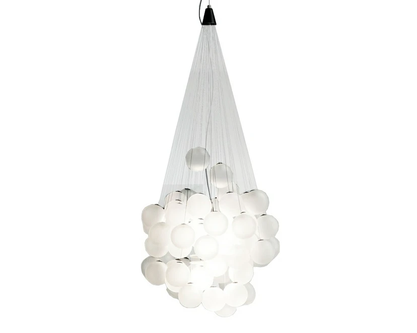 The pendant is available with 48 or 72 chandeliers, suspended in different heights. This helps create a decorative and imaginative cluster. Choose between opal white and opal metal.